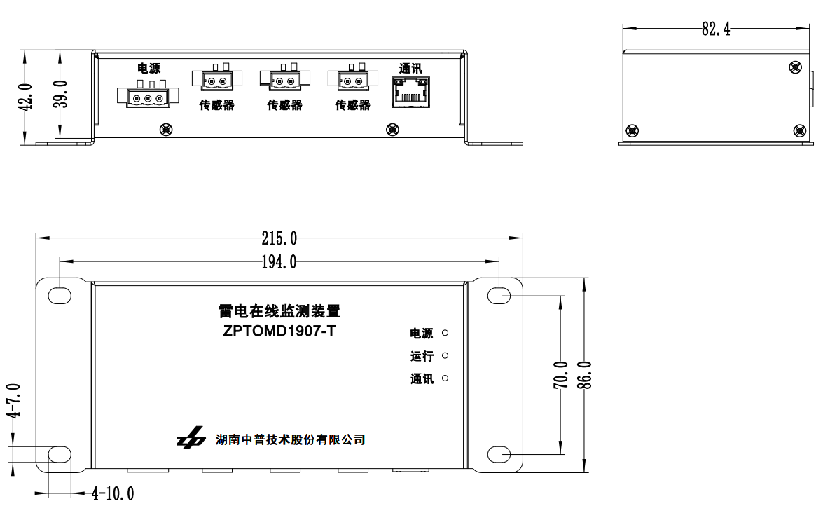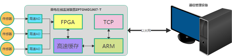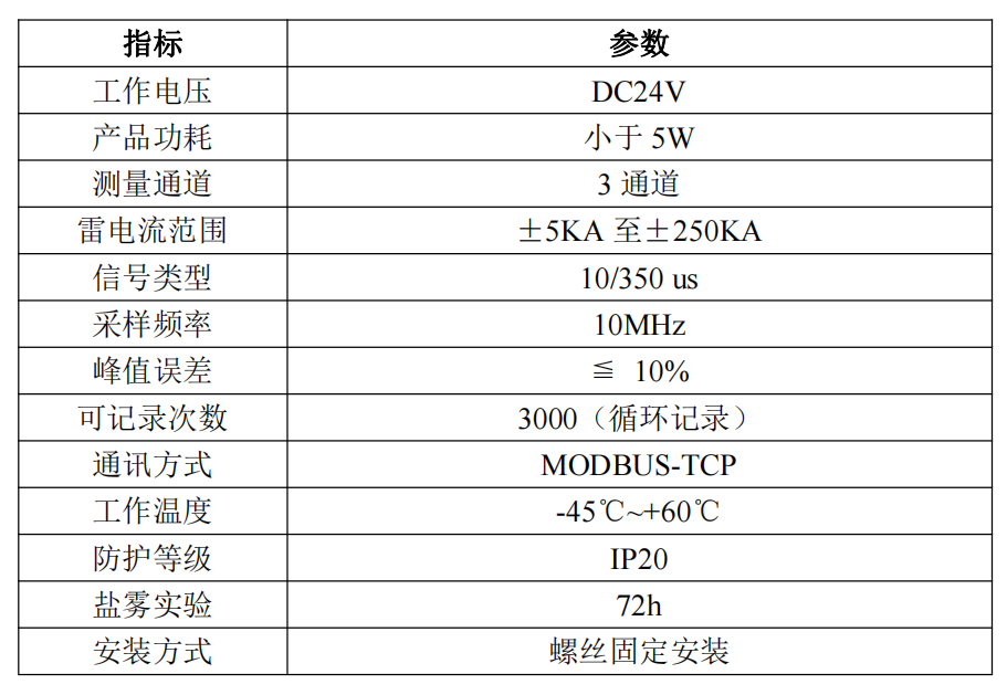 ZPTOMD1907-T型雷電在線監(jiān)測裝置是一種實時采集3路雷電流數(shù)據(jù)并具有通信功能的裝置,我公司具備該裝置的自主知識產(chǎn)權(quán)。裝置主要包含3 個雷電流傳感器、1個主機組成。該裝置可用于浪涌保護器、避雷針等其他設(shè)備。當(dāng)監(jiān)測點遭受雷擊時,裝置可實時記錄監(jiān)測點遭受的雷擊數(shù)據(jù),雷擊數(shù)據(jù)包括:記錄雷擊發(fā)生時間、雷電流幅值、雷電流極性、雷擊次數(shù)。裝置將處理好的雷擊數(shù)據(jù)進行本地存儲并通過MODBUS-TCP通訊方式輸出給后端modbus master。